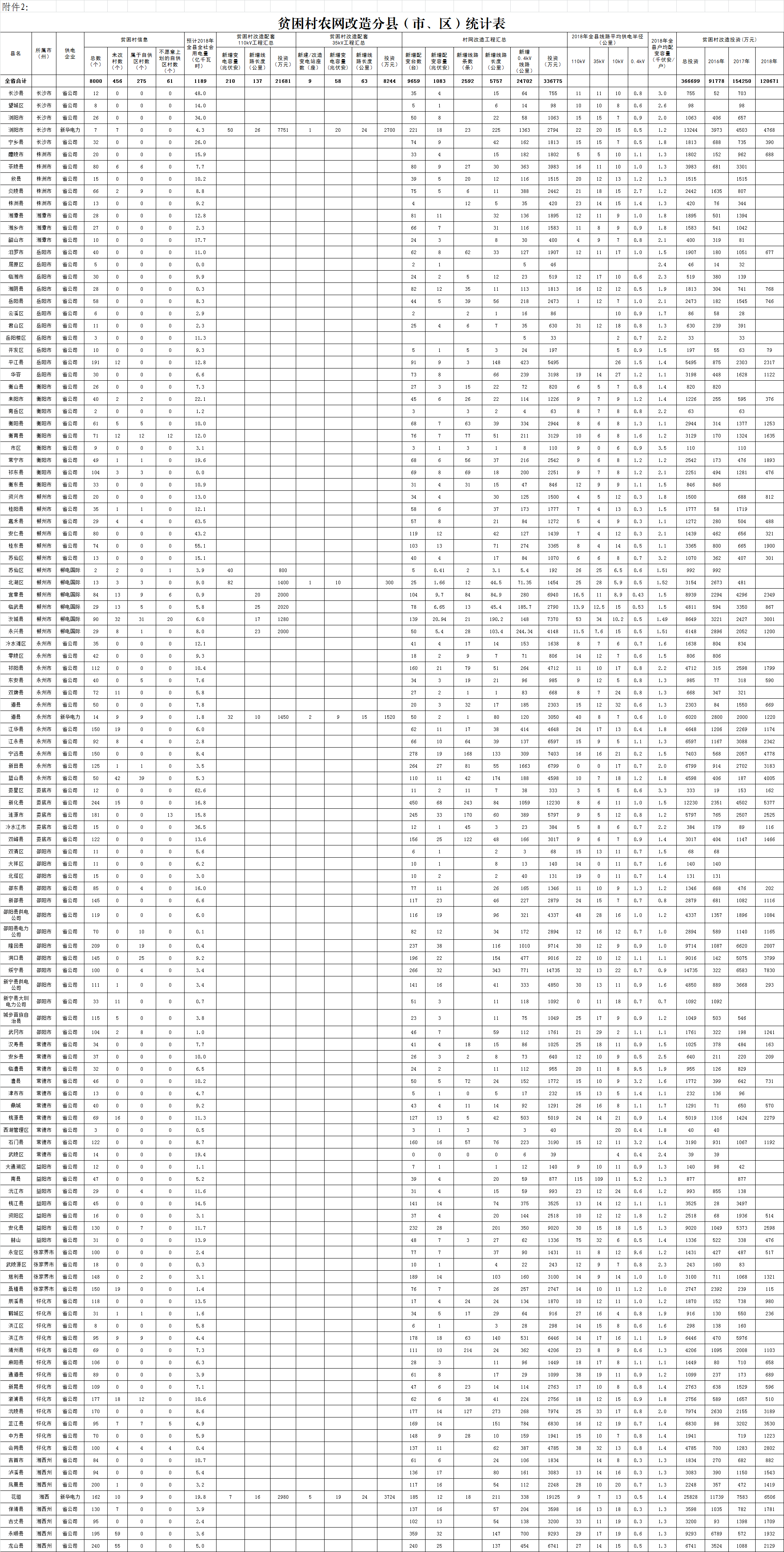 2016~2018年湖南省贫困地区脱贫攻坚农网改造升级工程新建或改造110千伏变电站11座,新增变电容量21万千伏安;新建或改造110千伏线路长度137公里。新建或改造35千伏变电站9座,新增变电容量6万千伏安;新建或改造35千伏线路长度63公里。新增10千伏配变容量107万千伏安,新建或改造10千伏线路长度5637公里。新建或改造低压线路长度24600公里。